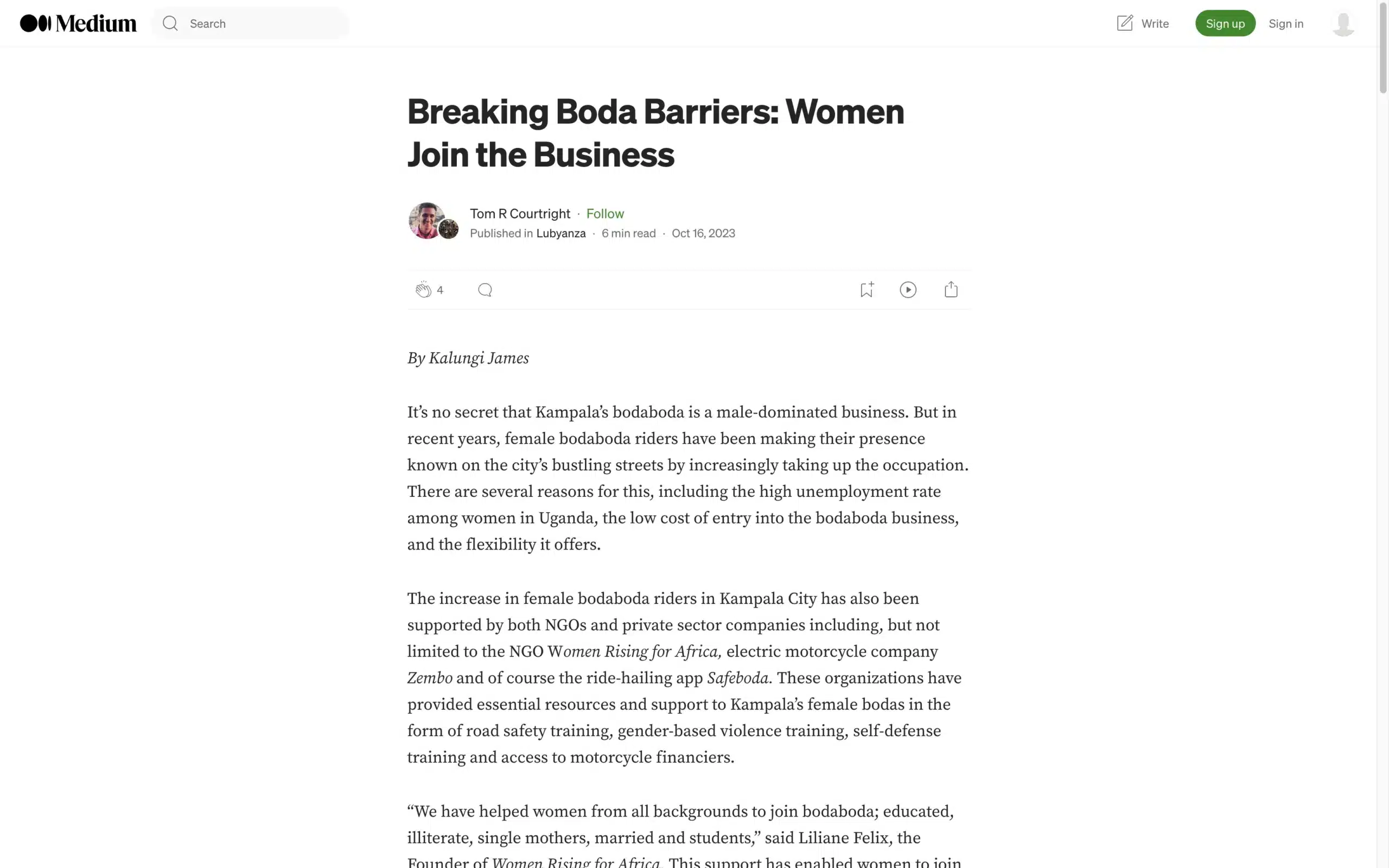The article “Breaking Boda Barriers: Women Join the Business” by Tom R Courtright in Lubyanza details how women in Kampala, Uganda, despite challenges such as sexual harassment and discrimination, brave women like Allen Kisakye are leveraging the flexibility and profitability of the bodaboda work. Organizations like Women Rising for Africa and companies like Zembo and Safeboda are supporting these women with training and resources. Despite risks and stigmas, these women are significantly contributing to Kampala’s economy and transportation system, challenging gender stereotypes and empowering themselves and their communities.